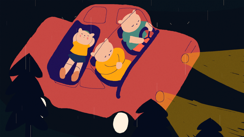 Ein kleiner Bär schläft während einer Autofahrt ein und hat einen abenteuerlichen Traum.