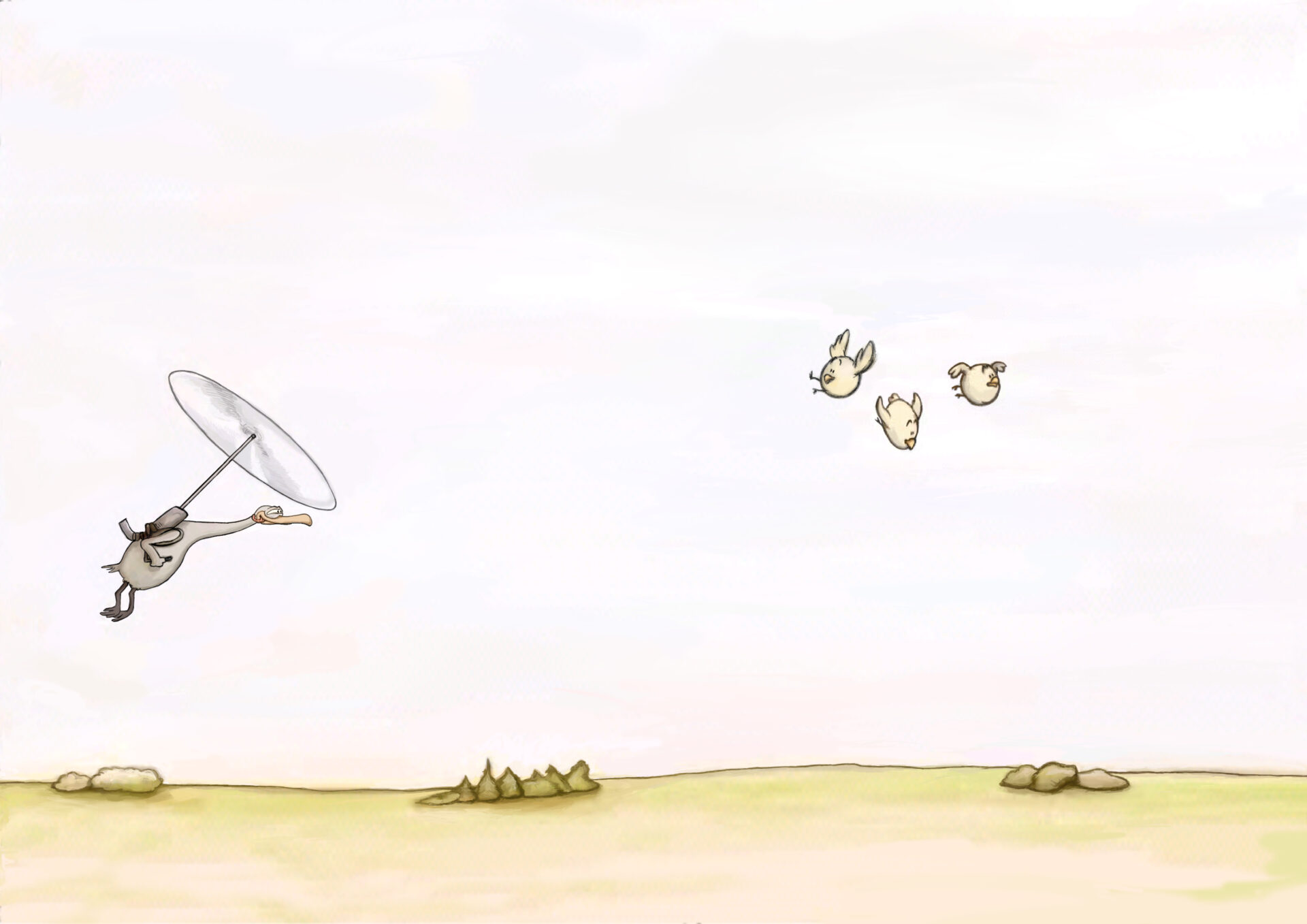 Auf einer sonnigen Waldlichtung üben sich drei kleine Vögel im Singen, bis …