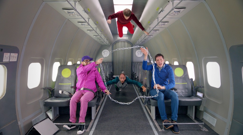 OK Go in Schwerelosigkeit. Die Bandmitglieder begaben sich an Bord einer Maschine der russischen Airline 57. Das Flugzeug vollführte schließlich eine Reihe von so genannten Parabelflügen. Dabei steigt der Flieger zunächts sehr steil in die Luft, um irgendwann abrupt einen Sturzflug einzuleiten. In dieser Phase herrscht an Bord Schwerelosigkeit. Ok Go und die Filmcrew nutzten diese kurzen, maximal 27 Sekunden dauernden Intervalle, um das Video zu drehen…