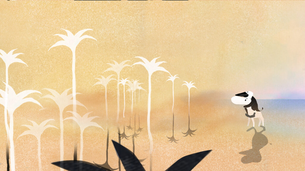 Das Wüstentier wird mit dem Schatten einer Palme geboren. Kein anderes Tier hat so einen komischen Schatten! Also begibt es sich auf Reisen bis ans Ende der