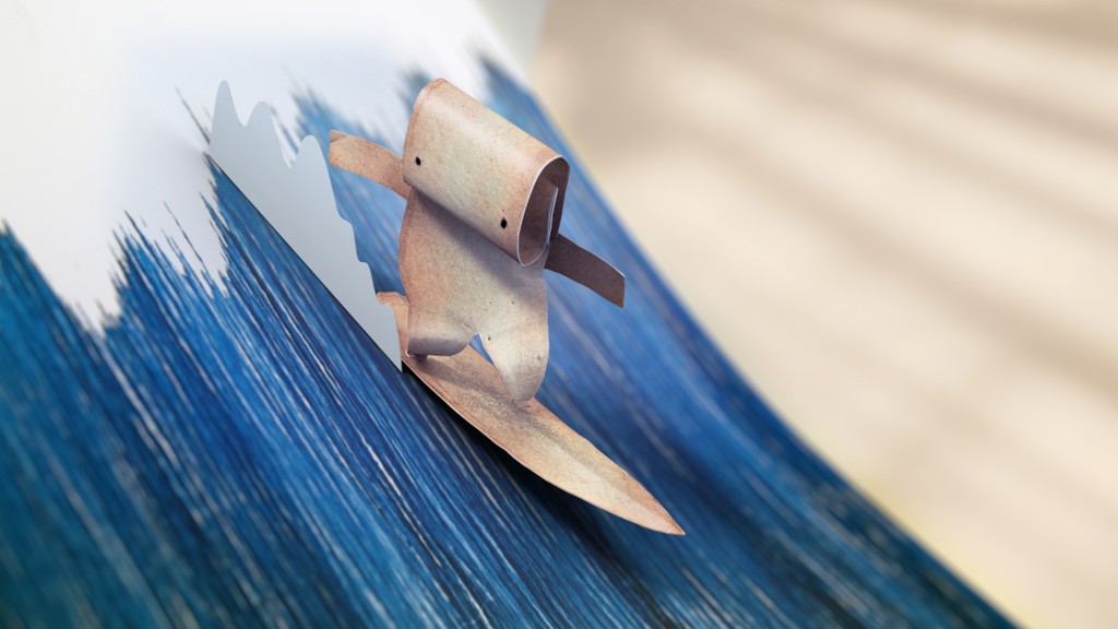 Ein Lesezeichen ist in einem Buch gefangen. Doch eines Tages fegt der Wind durchs Fenster. Das Lesezeichen kann sich befreien und begibt sich auf ein wildes Surfabenteuer.
